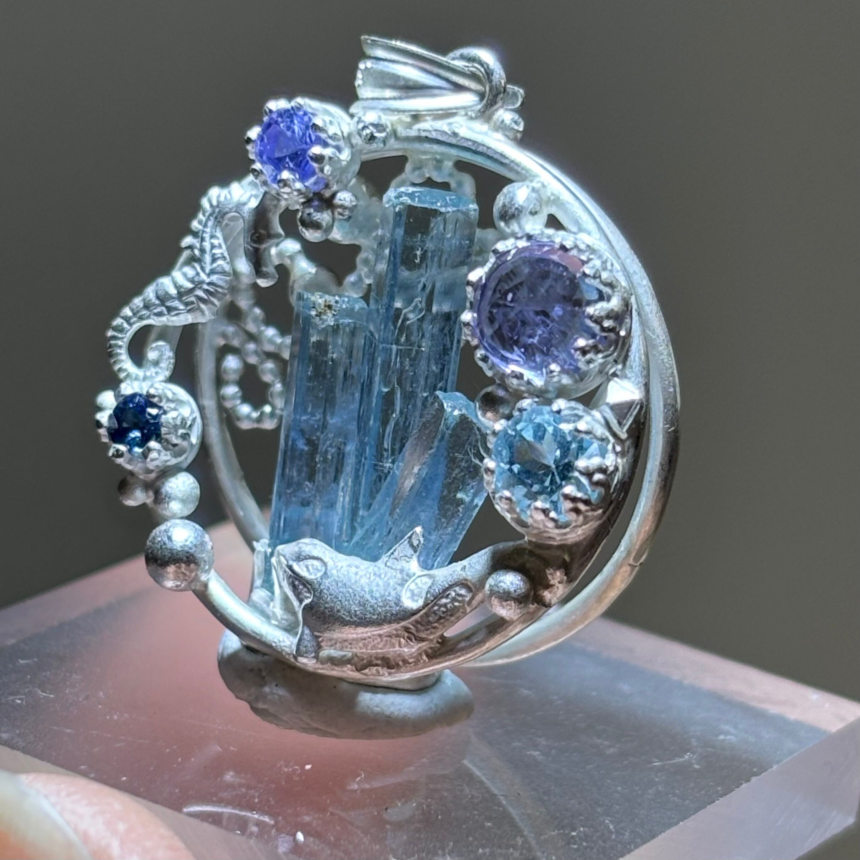 細身な円のフレームにシャチとタツノオトシゴ・水滴のような粒々を飾り、アクアマリン原石を差し込んだペンダントです