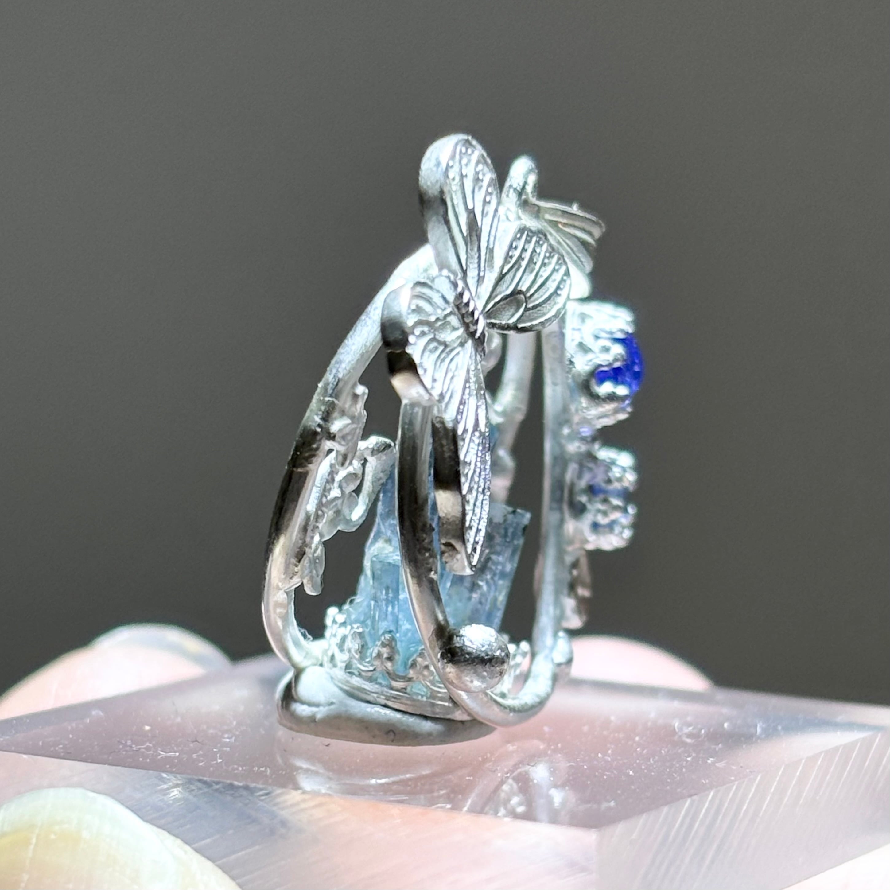 細身な円のフレームに蝶や花・水滴のような粒々を飾り、アクアマリン原石を差し込んだペンダントです