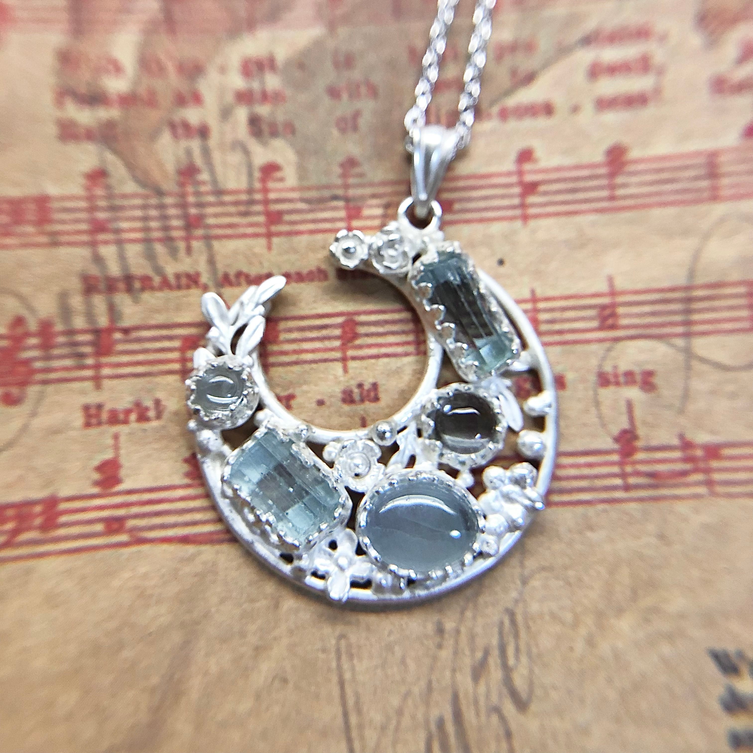 シルバーの三日月フレームの中に葉っぱとお花・水滴のような粒々を飾り、産地や形状の違うアクアマリンを5つ留めて仕上げたペンダントです。